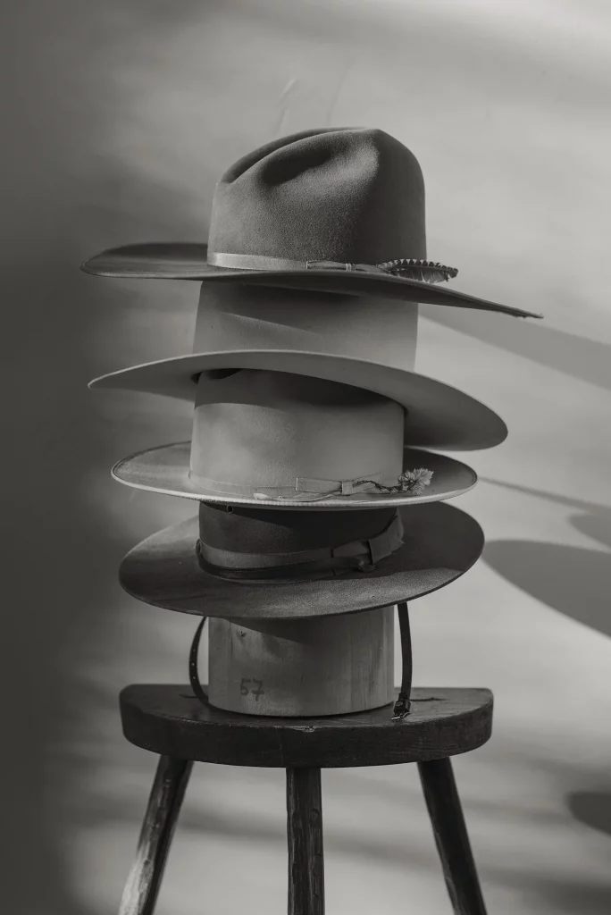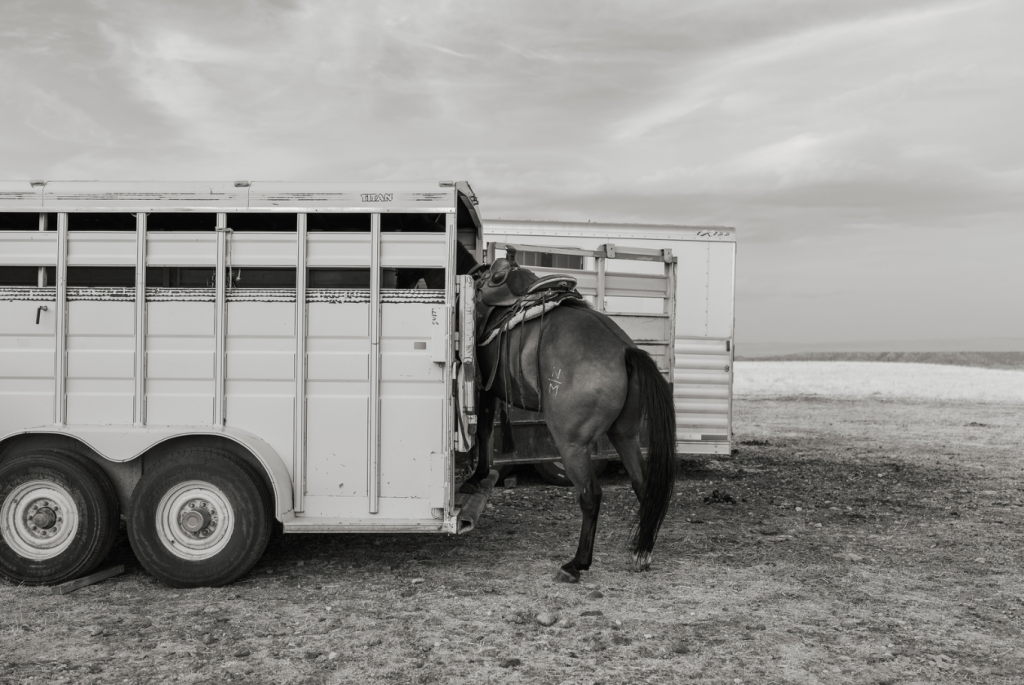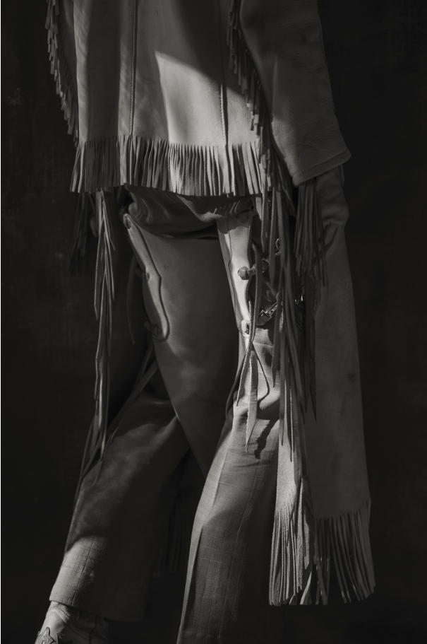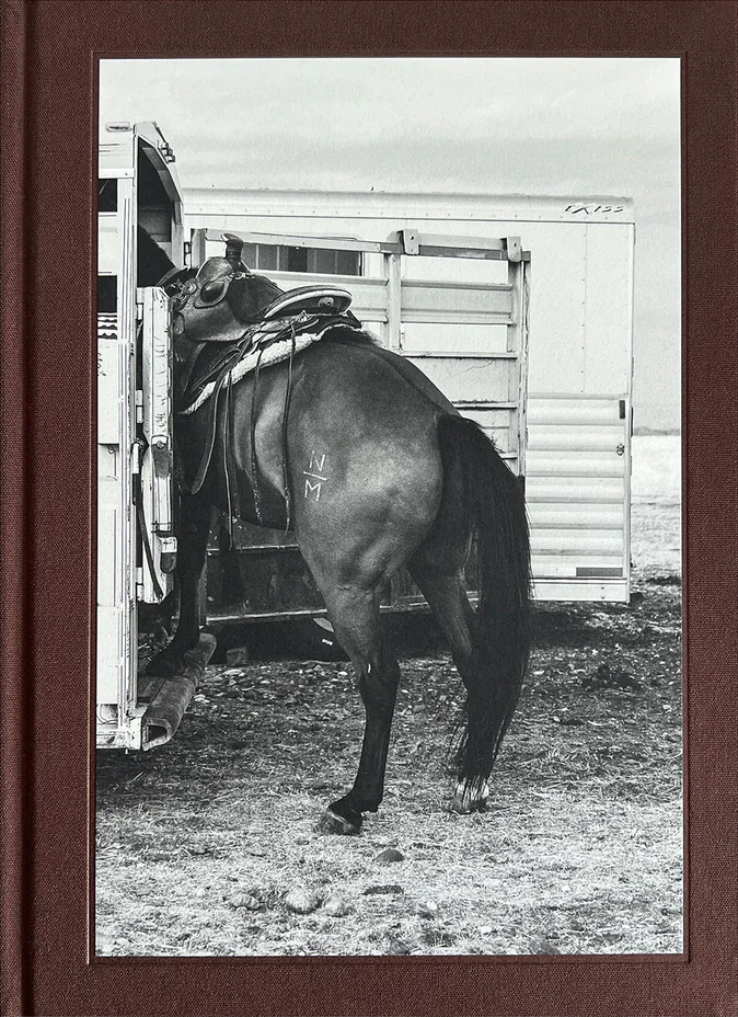 The book’s physical presentation enhances this journey of discovery, like a field journal documenting a personal pilgrimage. It starts off like a raw road trip, or a photographic diary of a quest, with the first image of a horse being immediately poignantly dedicated on the facing page, “For Mercury, my darling friend. Thank you for giving me a new perspective and teaching me to show up with joy, curiosity and respect.” This single dedication sets the profound emotional and ethical tone for the pages to follow. The second image immediately broadens the scope to the vast valleys and mountain ranges, with that iconic white hat visible in the corner, a “this is where we are going” type shot that establishes the scale of the challenge ahead. Further in, a front on, waist down shot wearing leather gloves, boots, a jacket, and chaps, all complete with fringes, feels like a deliberate “suit up” shot before getting down to the serious business of ethical transformation. At the end we see the same waist down image of her with leather gloves , boots, jacket and chaps both with fringes on it but this time from beHind its like an ending. we finish with the horse running wild after the journey.
