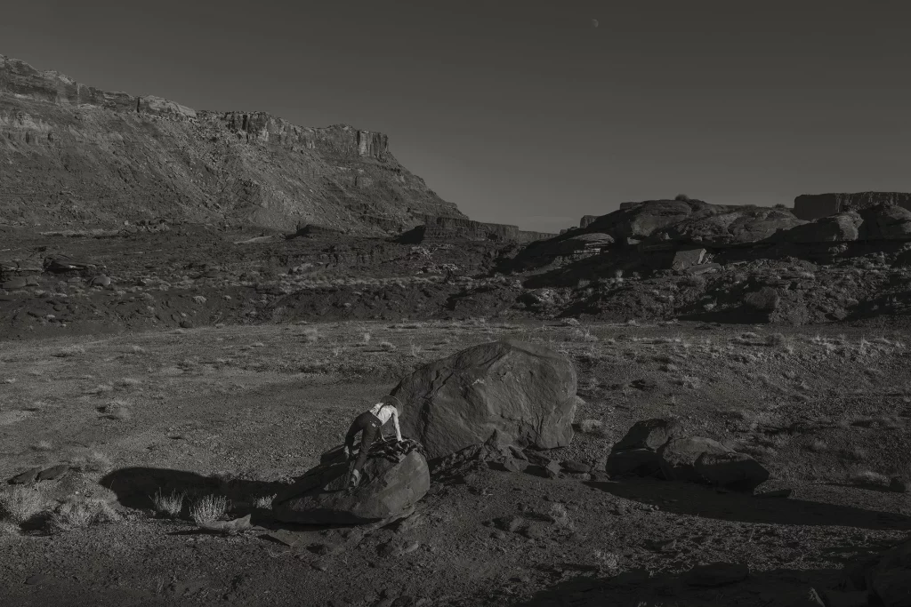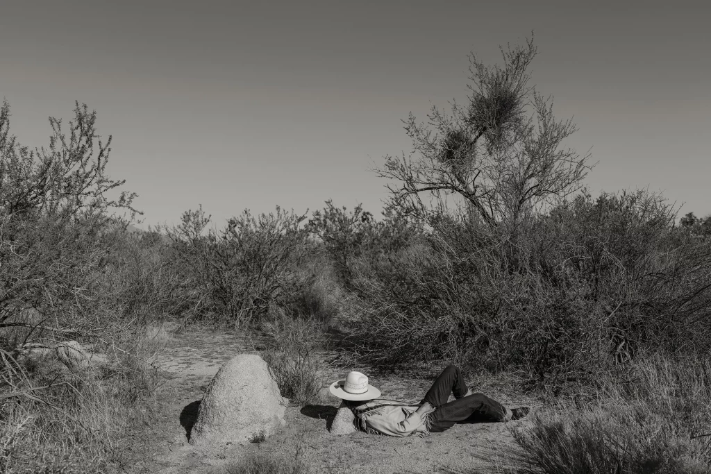 This ethical quest manifests visually in a spectacular, arresting aesthetic choice, the inky monochrome. By stripping away the noise and distraction of colour, Niemi transforms the landscape from a passive backdrop into an active character. The images emit a slow, organic quality, demanding that viewers become conscious of nature’s subtlety. It is in this monochromatic space that the true visceral tension resides, a white cowboy hat, the sole trace of a human hand, floats past a desert backdrop, instantly becoming a powerful, melancholic symbol of human detachment and fleeting presence. Elsewhere, the simple image of weeds creeping gently across a manmade pathway, slowly threatening access to a wooden jetty, captures the beautiful, unflinching power of nature’s quiet persistence, the earth effortlessly reclaiming our temporary, manmade structures. The horses galloping freely through a grassy plain, unbridled from the expectations of their owners, are a magnificent, electrifying vision of the very freedom and autonomy Niemi had to earn by letting go of hers.