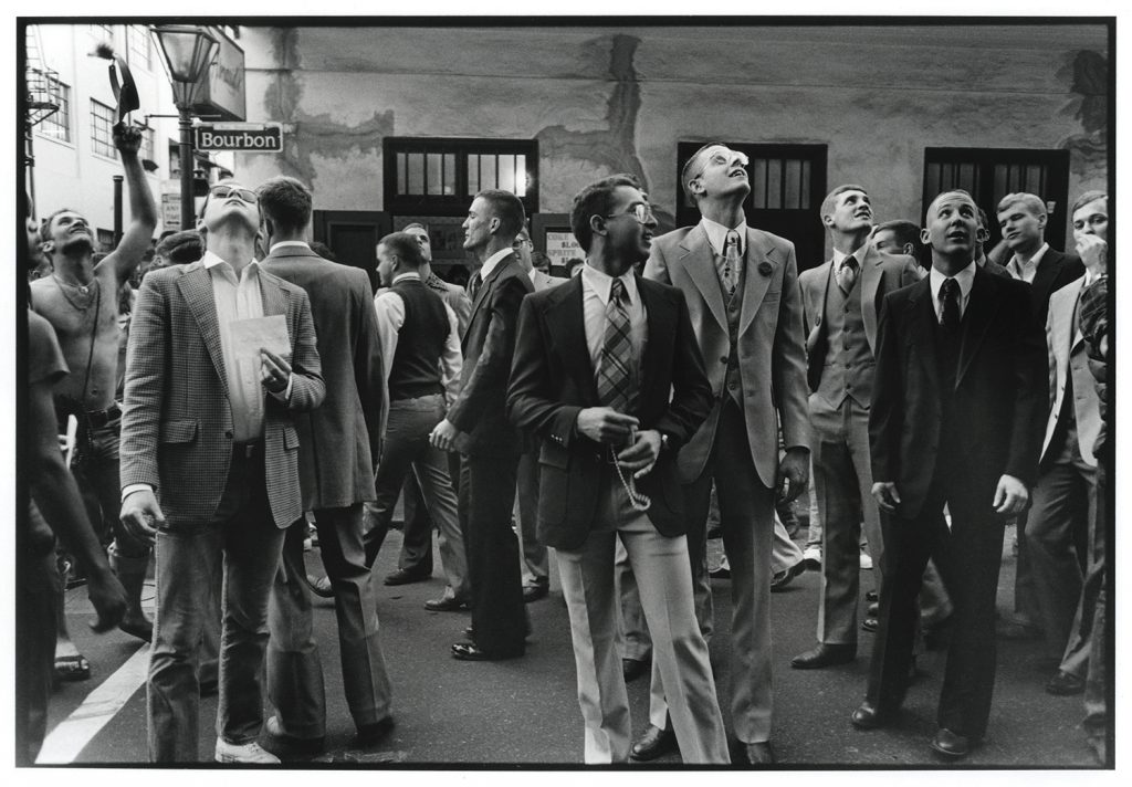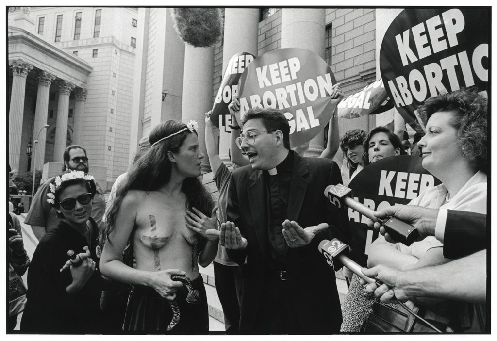 McAdams is driven by an enduring philosophy, always walk around with a camera, photograph what interests you, and record the life around you. This commitment meant she arrived at pivotal moments of history, whether it was shooting performances or covering protests. Her image of the topless woman with the stark black cross painted on her bare breasts, locking eyes with a besuited priest mid gesture at the foot of grand columns, is an image that screams of the confrontation between personal freedom and institutional power. The clash of the woman’s daisy crown against the priest’s collar captures the entire socio-political weight of that era.