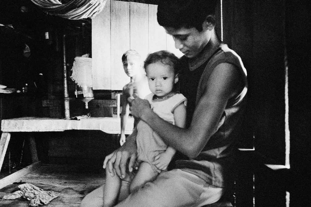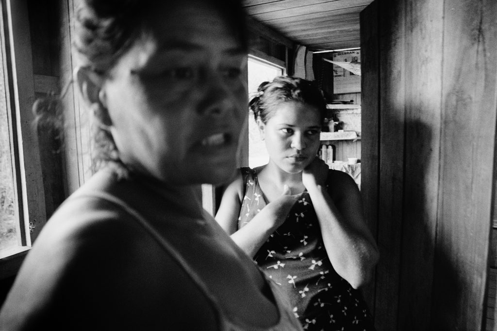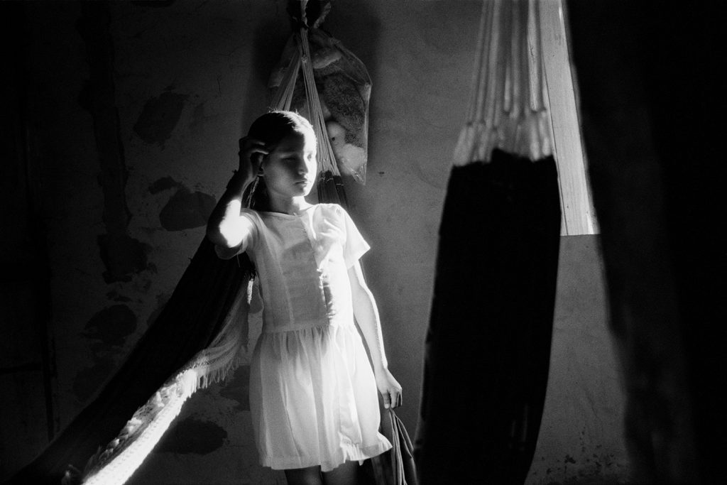 The true genius of Pommez’s work lies in her ability to make the immense seem intimate. She focuses on the women and children of the community, whose bodies and homes are intrinsically linked to the river. In one portrait, a young girl in a light dress stands in a rustic, dimly lit room, her hand raised to her ear in a contemplative pose. The black and white gives the scene a timeless, almost ghostly quality, as light streams from a window to illuminate her face while casting deep shadows on the peeling walls. It’s an image that captures a moment of quiet introspection, a silent world.