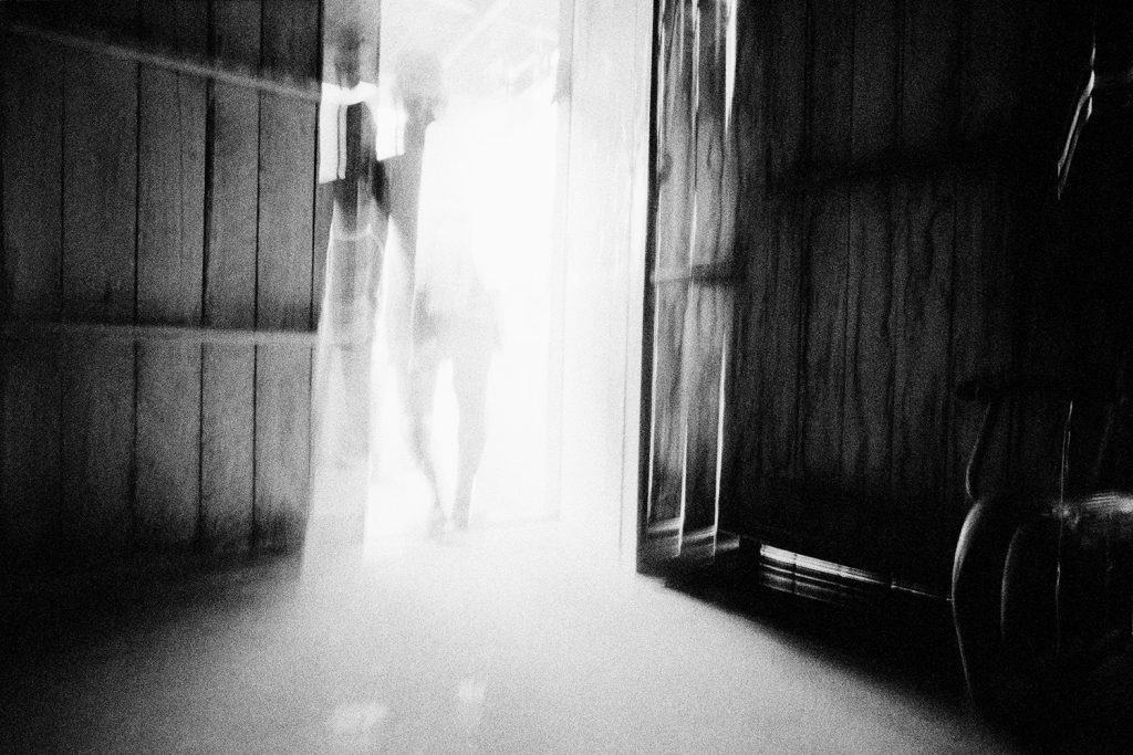 In another poignant scene, a figure walks through a doorway into a blinding light, their form blurred and ghostly against dark wooden walls. The overexposure gives it an otherworldly, transitional feel, like stepping from the known into the unknown.