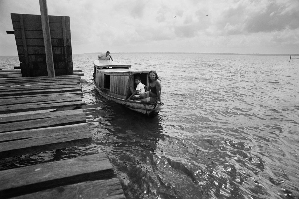Pommez broadens her focus to a scene of community and journey with a photograph of a small wooden boat floating on a calm river. The composition masterfully leads the eye from a rickety dock to the man, woman and child in the boat and then to the endless water that stretches to a distant horizon.